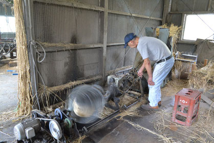 この機械で一度に綯えるのは約440m。1日機械を稼働させても6〜7玉作るのが限度だそうです。