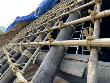 茅葺きの現場でわら縄は、なくてはならない存在です。屋根の下地補修では垂木や竹を固定するために、また茅を葺く際には竹を縫いつけて茅をしっかりと抑えるために使われます。